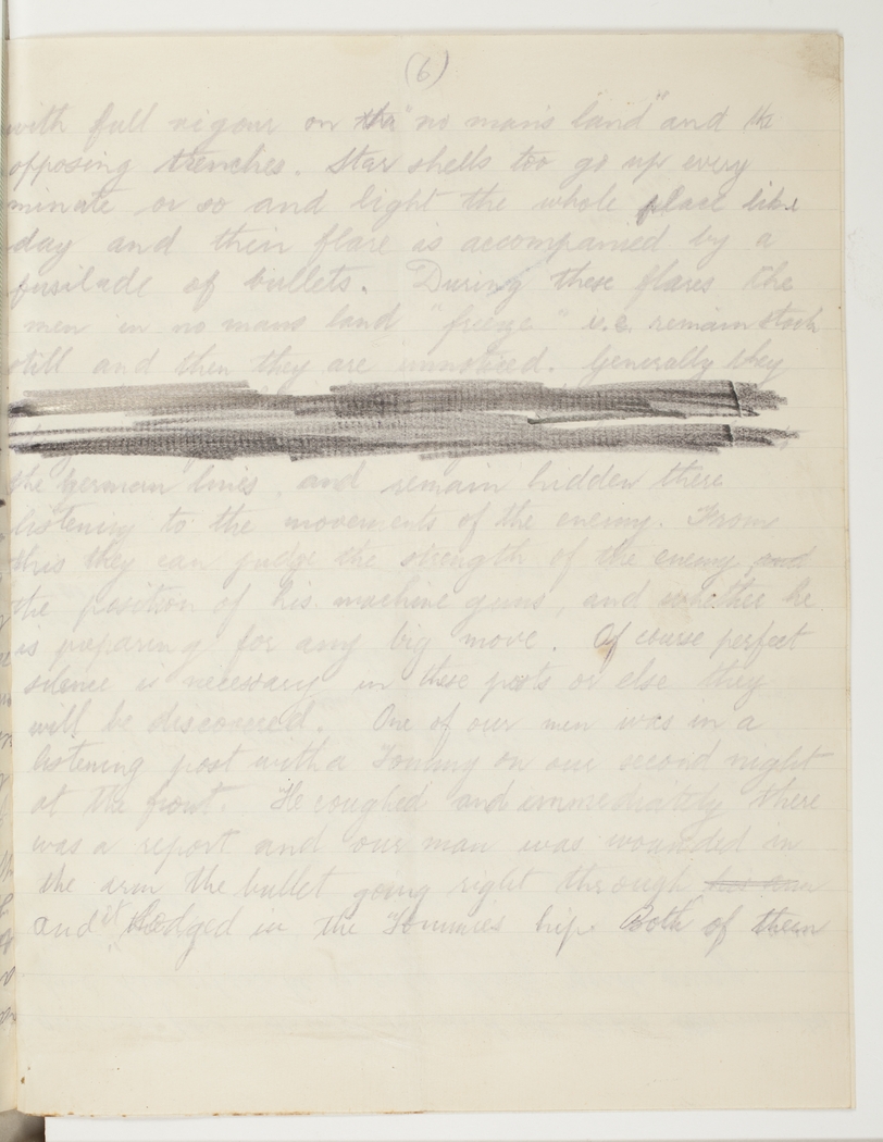 with full vigour on "no man's land" and the opposing trenches. Star shells go up every minute or so and light the whole place like day and their flare is accompanied by a fusilade of bullets. During these flares the men in no mans land "freeze" i.e. remain stock still and then they are unnoticed. Generally they [Two lines blacked out by censor] the German lines, and remain hidden there listening to the movements of the enemy. From this they can judge the strength of the enemy, and the position of his machine guns, and whether he is preparing for any big move.