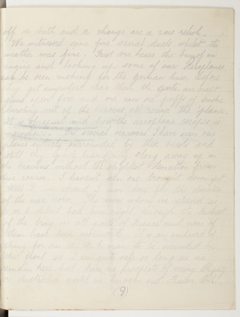 We witnessed some fine aerial duels whilst the weather was fine. First one hears the buzz of an engine and looking up some of our Aeroplanes can be seen making for the German lines. Before they get anywhere near them the Anti-aircraft guns open fire and one can see