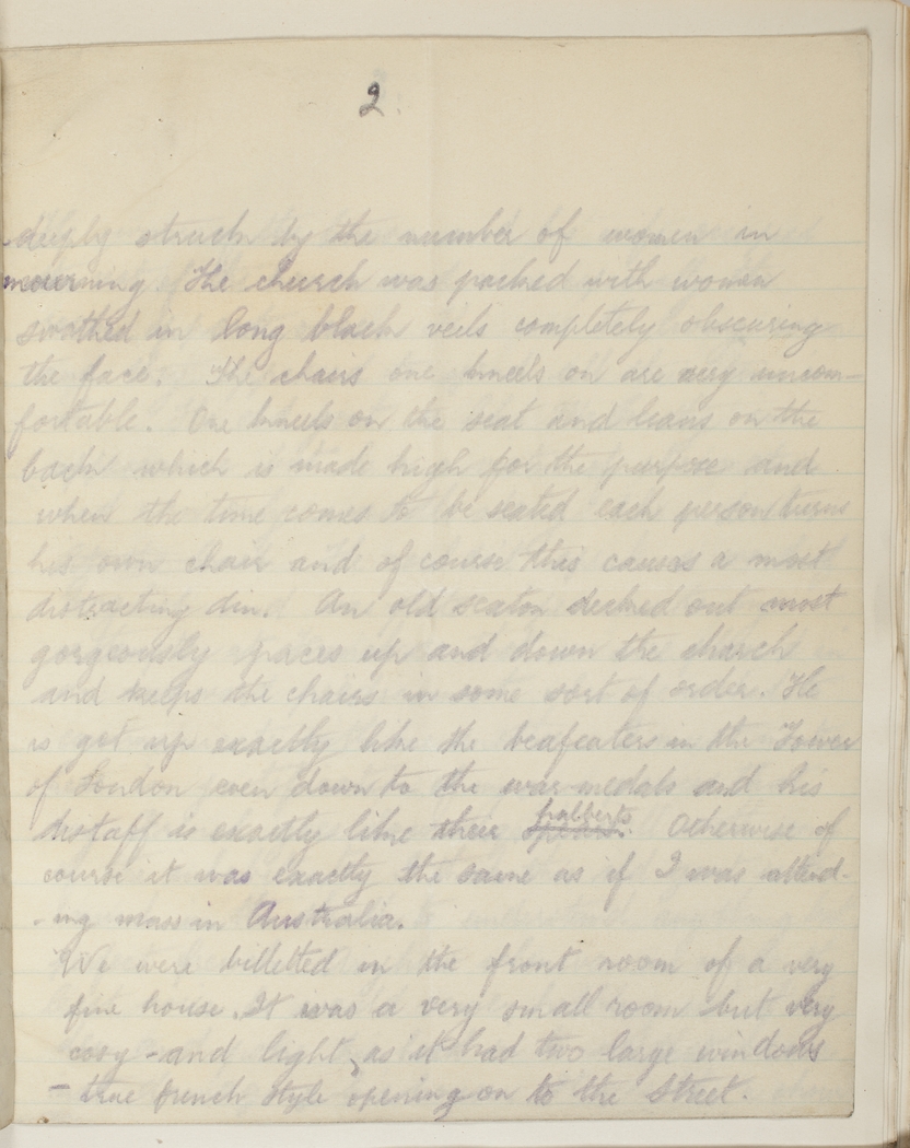 The chairs one kneels on are very uncomfortable. One kneels on the seat and leans on the back which is made high for the purpose and when the time comes this causes a most distracting din. An old sexton decked out most gorgeously paces up and down the church and keeps the chairs in some sort of order. He is got up exactly like the beafeaters in the Tower of London even down to the war medals and his distaff is exactly like their spears halberts). Otherwise of course it was exactly the same as if I was attending mass in Australia.
