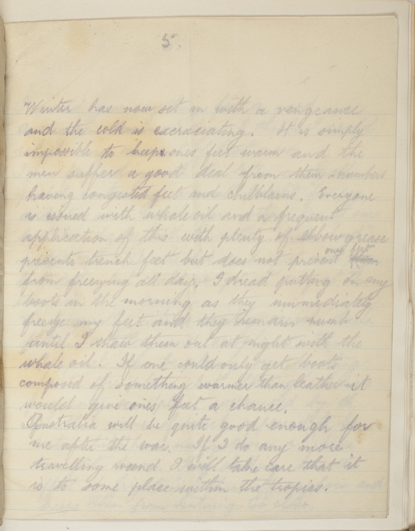 Winter has now set in with a vengeance and the cold is excruciating. It is simply impossible to keep one's feet warm and the men suffer a good deal from them - numbers having congested feet and chilblains. Everyone is issued with whale oil and a frequent application of this with plenty of elbow grease prevents trench feet but does not prevent my feet from freezing all day. I dread putting on my boots in the morning as they immediately freeze my feet and they remain numb until I thaw them out at night with the whale oil. If one could only get boots composed of something warmer than leather it would give one's feet a chance.