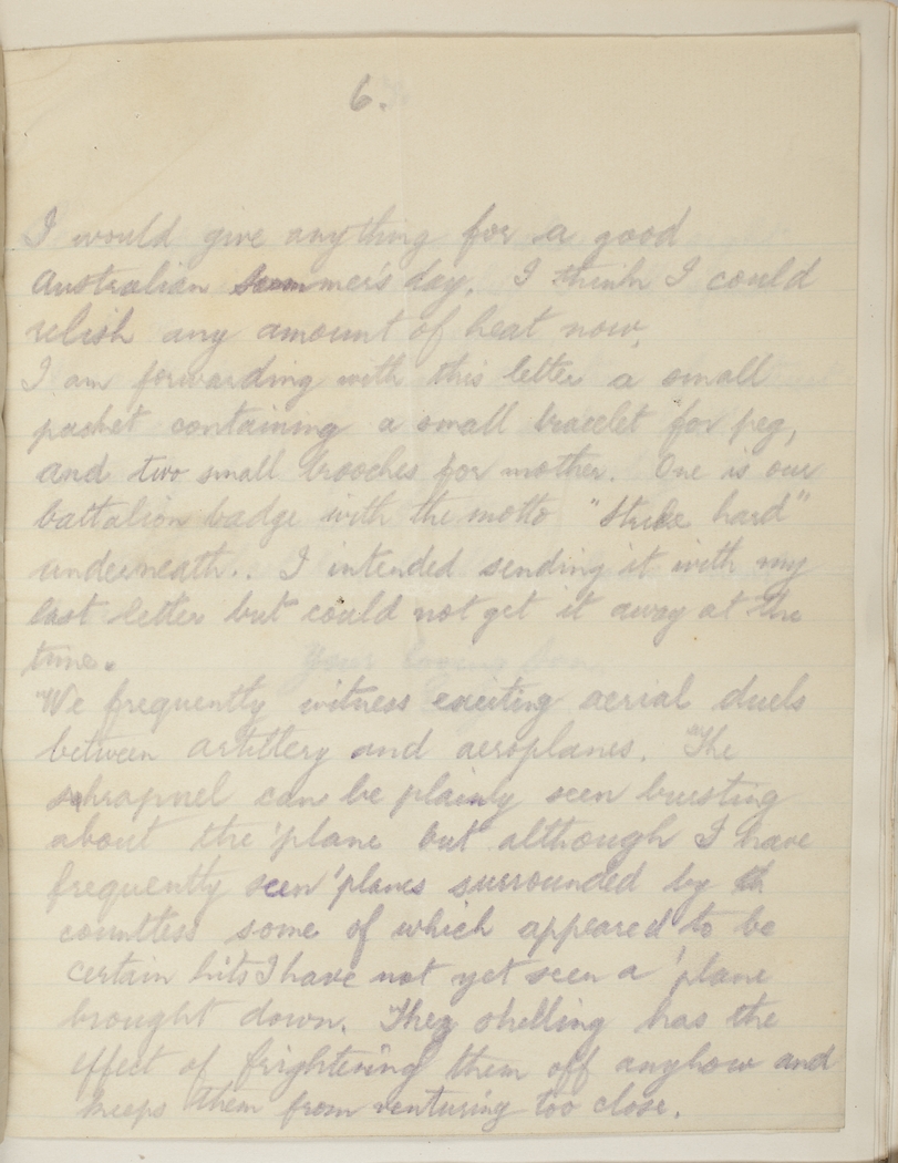 I am forwarding with this letter a small packet containing a small bracelet for pet, and two small brooches for mother. One is our battalion badge with the motto "Strike hard" underneath. I intended sending it with my last letter but could not get it away at the time.