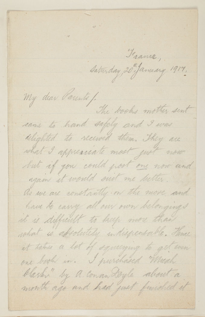 The books mother sent me came to hand safely and I was delighted to received them. They are what I appreciate most just now but if you could post one now and again it would suit me better. As we are constantly on the move and have to carry all our own belongings it is difficult to keep more than what is absolutely indispensable. Hence it takes a lot of squeezing to get even one book in.