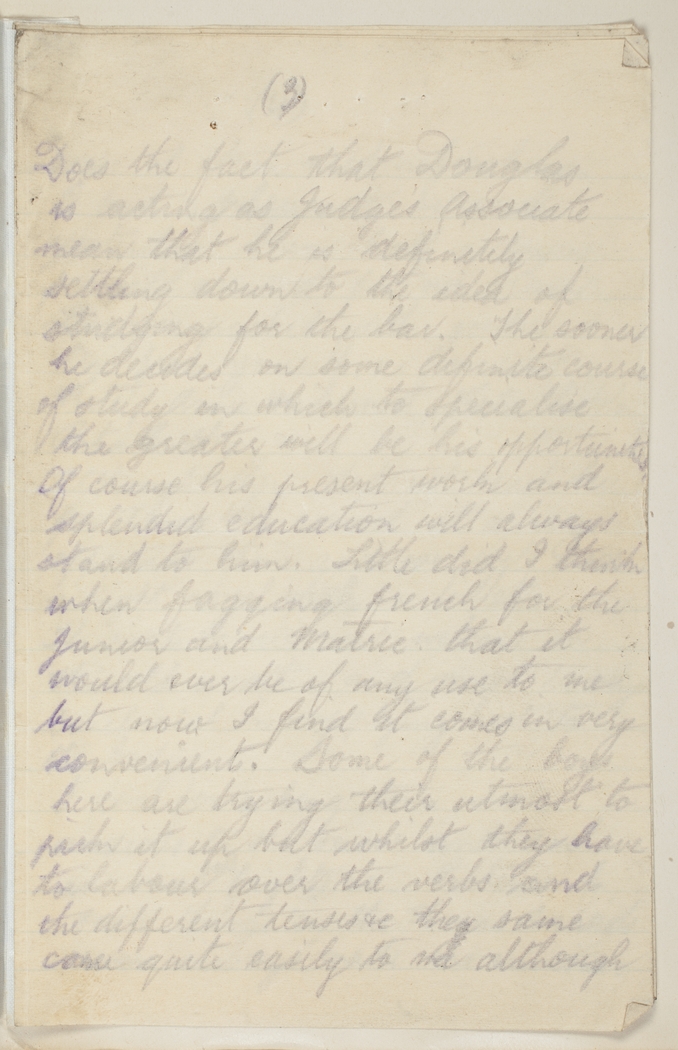 Does the fact that Douglas's acting as Judge's Associate mean that he is definitely settling down to the idea of studying for the bar. The sooner he decides on some definite course of study in which to specialise the greater will be his opportunities. Of course his present work and splendid education will always stand to him. Little did I think when fagging french for the Junior and Matric that it would ever be of any use to me, but now I think it comes in very convenient. Some of the boys here are doing their utmost trying to pick it up but whilst they have to labour over the verbs and the different tenses &c the same came quite easily to me although