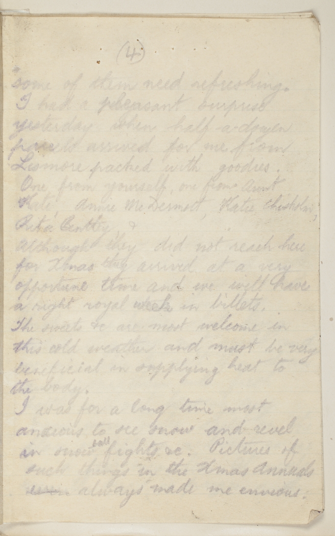 I had a pleasant surprise yesterday when half-a-dozen parcels arrived for me from Lismore packed with goodies. One from yourself, one from Aunt Kate, Annie McDermott, Katie Chisholm, Rita Bentley. Although they did not reach here for Xmas they arrived at a very opportune time and we will have a right royal week in billets. The sweets &c. are most welcome in this cold weather and must be very beneficial in supplying heat to the body.