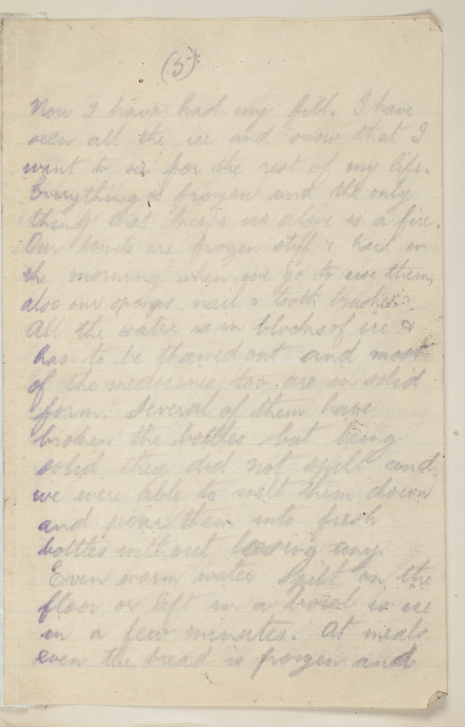 Now I have had my fill. I have seen all the ice and snow that I want to see for the rest of my life. Everything here is frozen and the only thing that keeps us alive is a fire. Our towels are frozen stiff and hard in the mornings when we go to use them, also our sponges, nail and tooth brushes. All the water is in blocks of ice & has to be thawed out and most of the medicines too, are in solid form. Several of them have broken the bottles but being solid they did not spill and we were able to melt them down and pour them into fresh bottles without losing any. Even warm water spilt on the floor or left in a bowl is ice in a few minutes. At meals even the bread is frozen and