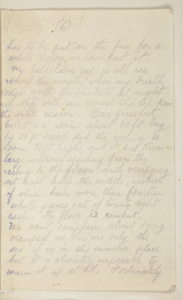 My balaclava cap is all ice round the mouth where my breath lodges and the blankets at night are stiff with ice round the top from the same reason. Our present billet is a room about 60 ft. long by 20 ft. broad and the ceiling is some 30 ft. high, and it has two large windows reaching from the ceiling to the floor and occupying at least half the width, neither of which have more than fourteen whole panes out of twenty eight each. The floor is cement. We can't complain about being cramped as there are only the six of us in this immense place but it is absolutely impossible to warm it up at all. Fortunately