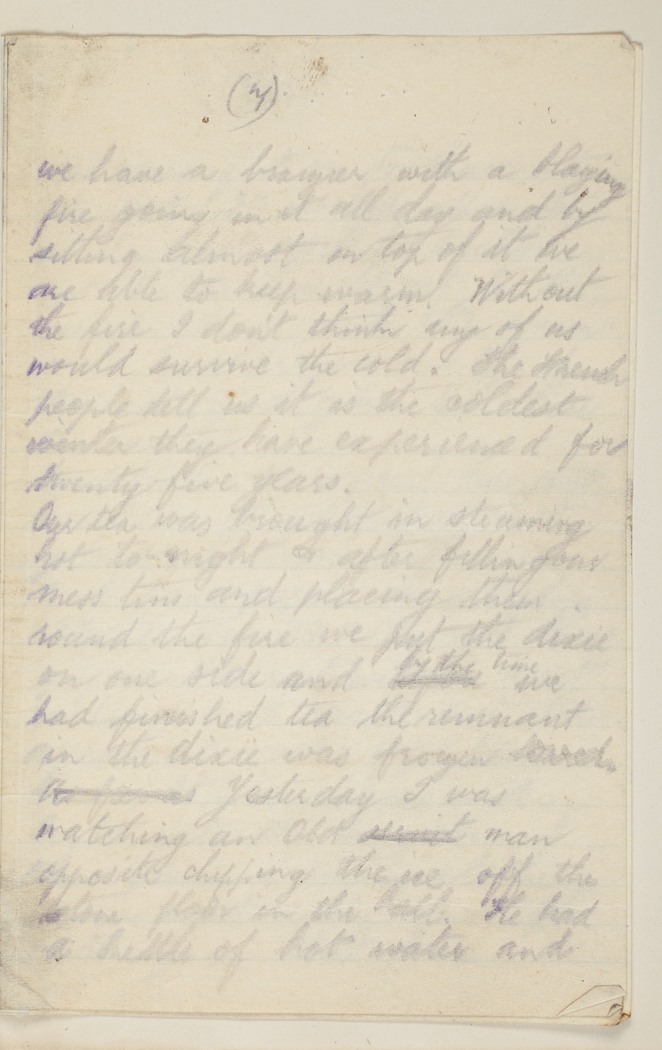 we have a brazier with a blazing fire going in it all day and by sittiing almost on top of it we are able to keep warm. Without the fire I don't think any of us would survive the cold. The French people tell us it is the coldest winter they have experienced in twenty five years.