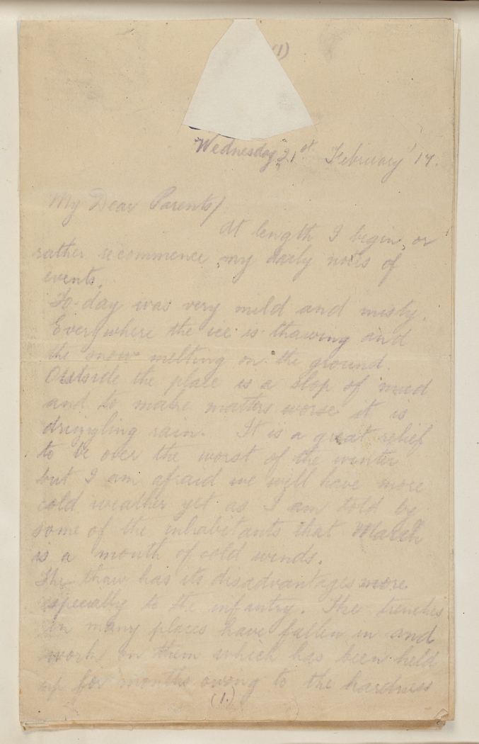 The thaw has its disadvantages more especially to the infantry. The trenches in some places have fallen in and work on them which has been held up for months owing to the hardness