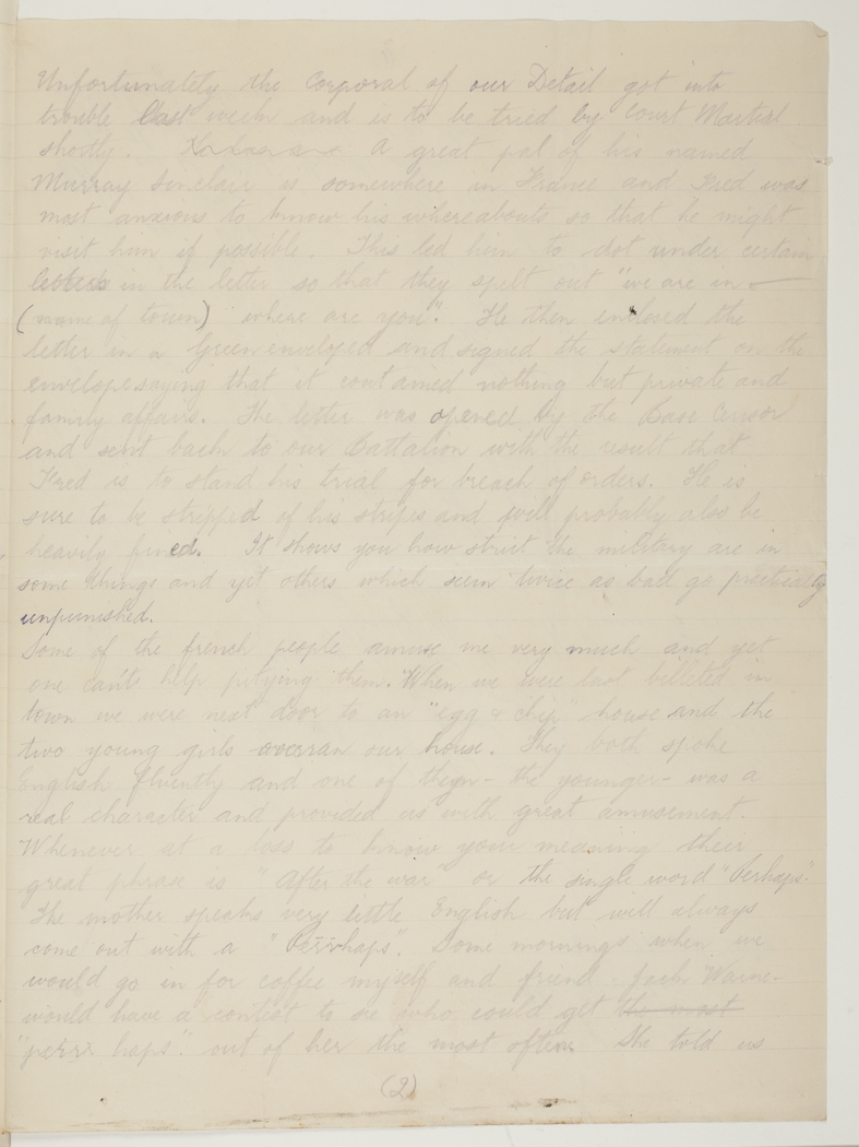 Unfortunately the Corporal of our Detail got into trouble last week and is to be tried by Court Martial shortly. A great pal of his named Murray Sinclair is somewhere in France and Fred was most anxious to know his whereabouts so that he might visit him if possible. This led him to dot under certain letters in the letter so that they spelt out "we are in (name of town) where are you." He then enclosed the letter in a Green envelope and signed the statement on the envelope saying that it contained nothing but private and family affairs. The letter was opened by the Base Censor and sent back to our Battalion with the result that Fred is to stand his trial for breach of orders. He is sure to be stripped of his stripes and will probably also be heavily fined. It shows you how strict the military are in some things and yet others which seem twice as bad go practically unpunished.