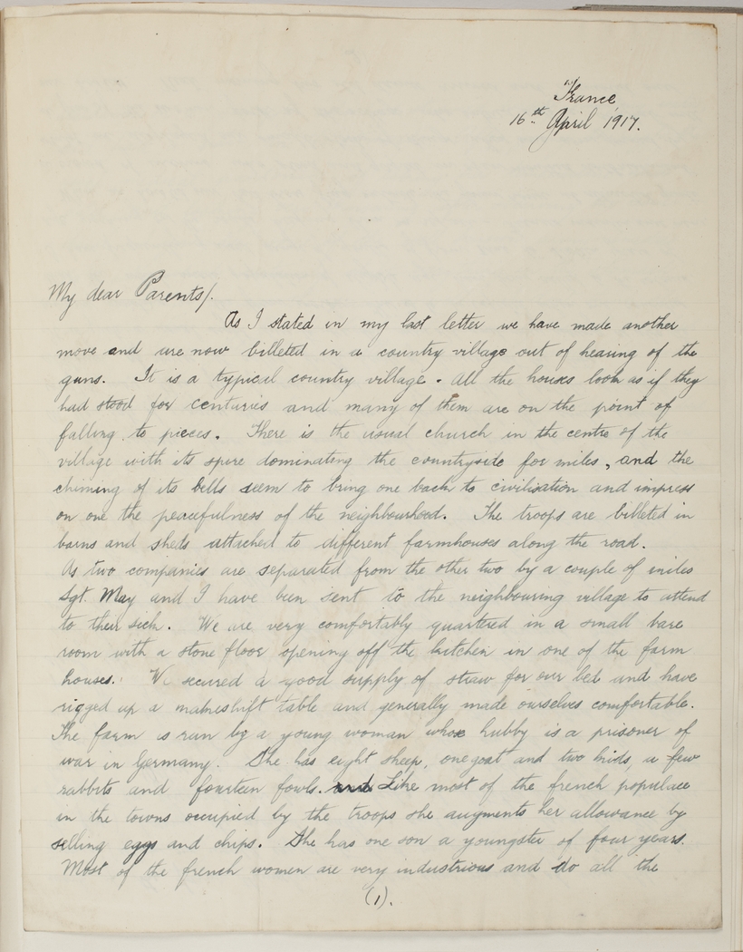 As I stated in my last letter we have made another move and are now billeted in a country village out of hearing of the guns. It is a typical country village. All the houses look as if they had stood for centuries and many of them are on the point of falling to pieces. There is the usual church in the centre of the village with its spire dominating the countryside for miles, and the chiming of its bells seem to bring one back to civilisation and impress on one the peacefulness of the neighbourhood.