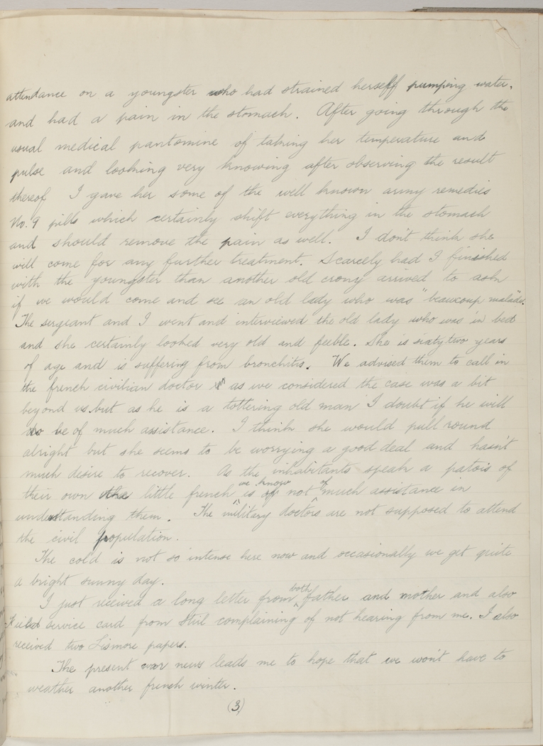Scarcely had I finished with the youngster than another old crony arrived to ask if we would come and see an old lady who "beaucoup malade". The sergeant and I went and interviewed the old lady who was in bed and she certainly looked very old and feeble. She is sixty two years of age and is suffering from bronchitis. We advised them to call in the french civilian doctor as we considered the case was a bit beyond us, but as he is a tottering old man I doubt if he will be of much assistance. I think she would pull round alright but she seems to be worrying a good deal and hasn't much desire to recover. As the inhabitants speak a patois of their own the little french we know is not of much assistance in understanding them. The military doctors are not supposed to attend the civil population.