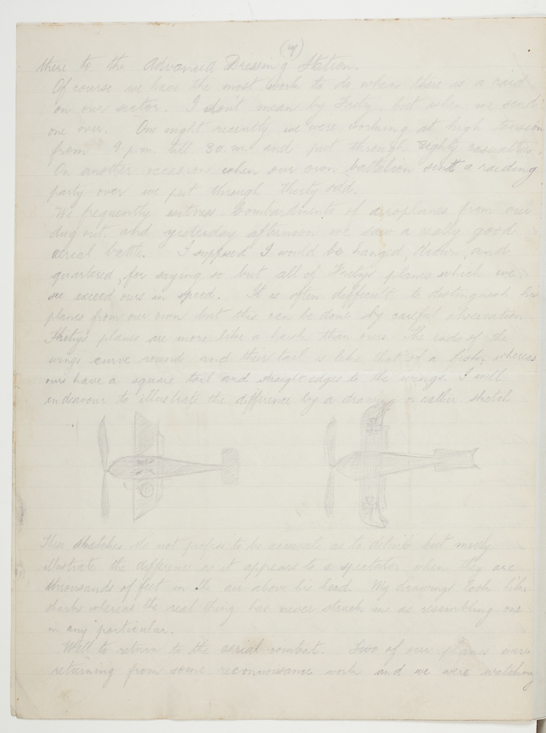 This little sketch of one night's work will give you an idea of what we really do. We have not any of the bearing to do as the S.B.'s bring the wounded down to our Aid Post and the Ambulance bearers carry them from