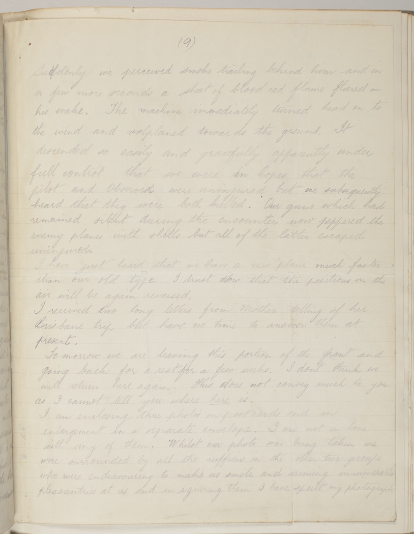 Suddenly we perceived smoke trailing behind him and in a few more seconds a sheet of blood red flame flared in his wake. The machine immediately turned head on to the wind and volplaned towards the ground. It descended so easily and gracefully apparently under full control that we were in hopes that the pilot and Observer were uninjured but we subsequently heard that they were both killed. Our guns which had remained silent during the encounter now peppered the enemy planes with shells but all of the latter escaped uninjured.