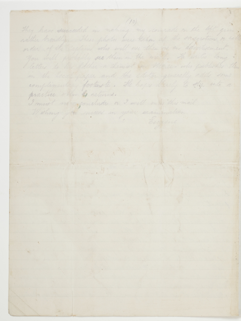 They have succeeded in making my comrade on the left grin rather broadly. These photographs were taken at the suggestion or rather order of the Captain who will use them as an advertisement. You will probably see them in the mail. He writes long letters to his father a Chemist in Moree - who publishes them in the local paper and the editor generally adds some complimentary footnote. He hopes thereby to step into a practice when he returns.