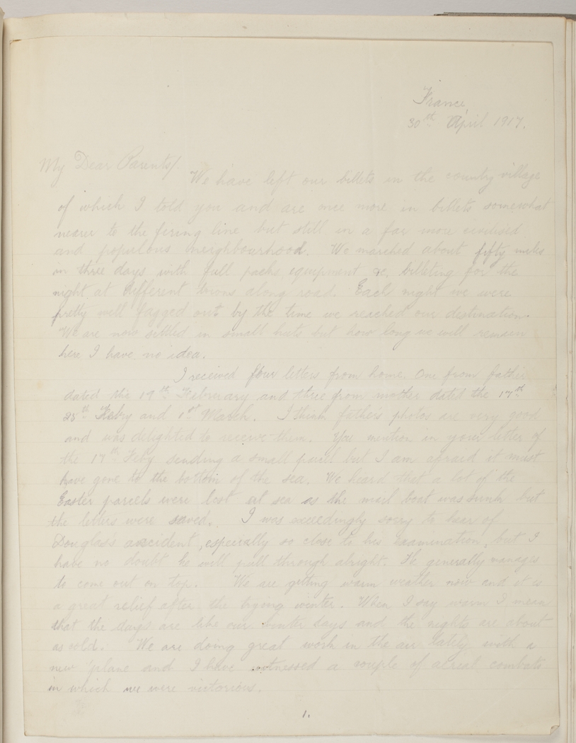 I received four letters from home. One from father dated the 19th. February and three from mother dated the 17th., 25th. Feby. and 1st. March. I think father's photos are very good and was delighted to receive them. You mention in your letter of 17th. Feby. sending a small parcel but I am afraid it must have gone to the bottom of the sea. We heard that a lot of the Easter parcels were lost at sea as the mail boat was sunk but the letters were saved. I was exceedingly sorry to hear of Douglas's accident, especially so close to his examination, but I have no doubt he will pull through alright. He generally manages to come out on top. We are getting warm weather now and it is a great relief after the trying winter. When I say warm I mean that the days are like our winter days and the nights are about as cold. We are doing great work in the air lately with a new 'plane and I have witnessed a couple of aerial combats in which we were victorious.