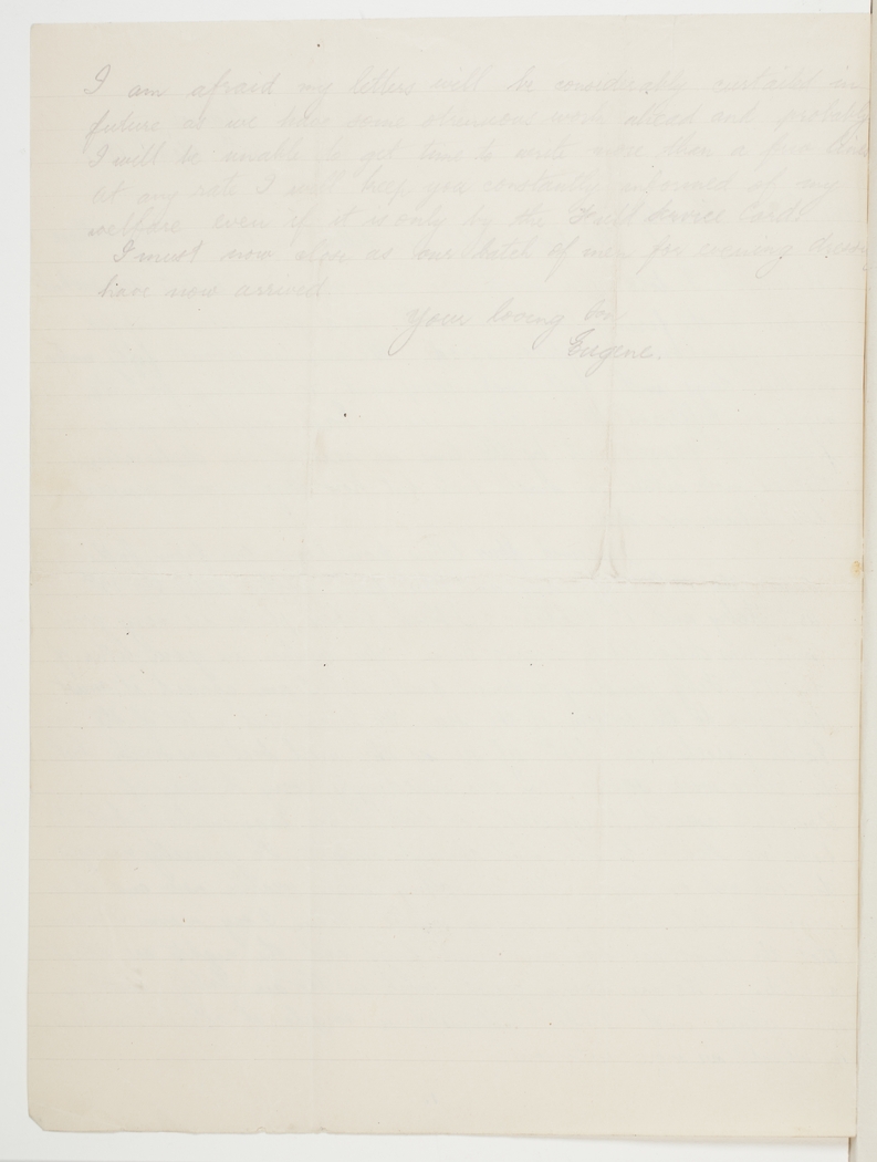 I am afraid my letters will be considerably curtailed in future as we have some strenuous work ahead and probably I will be unable to get time to write more than a few lines. At any rate I will keep you constantly informed of my welfare even if it is only by the Field Service Card.
