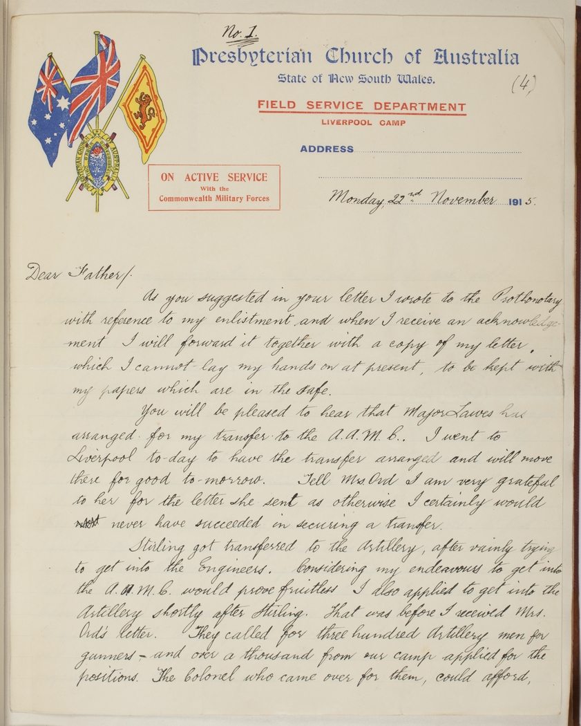 Stirling got transferred to the Artillery, after vainly trying to get into the Engineers. Considering my endeavours to get into the A.A.M.C. would prove fruitless I also applied to get into the Artillery shortly after Stirling. That was before I received Mrs. Ord's letter. They called for three hundred Artillery men for gunners - and over a thousand from my camp applied for the positions. The Colonel who came over for them, could afford,