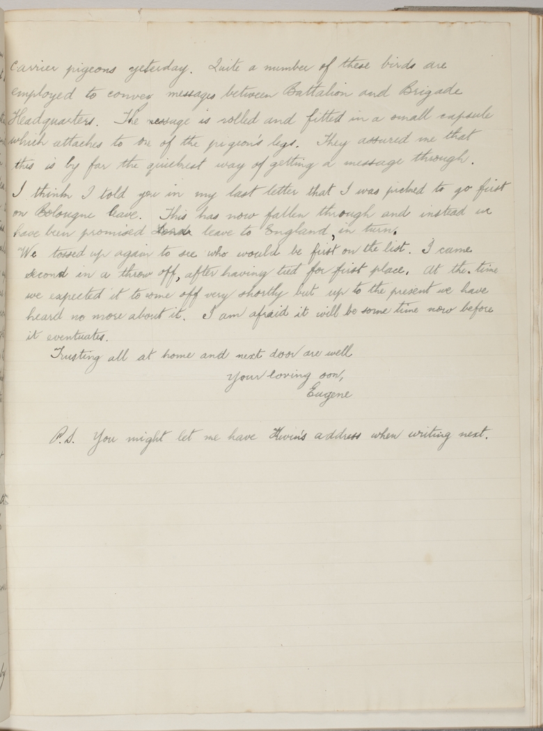 carrier pigeons yesterday. Quite a number of these birds are employed to convey messages between Battalion and Brigade Headquarters. The message is rolled and fitted in a small capsule which attaches to one of the pigeon's legs. They assured me that this is by far the quickest way of getting a message through.