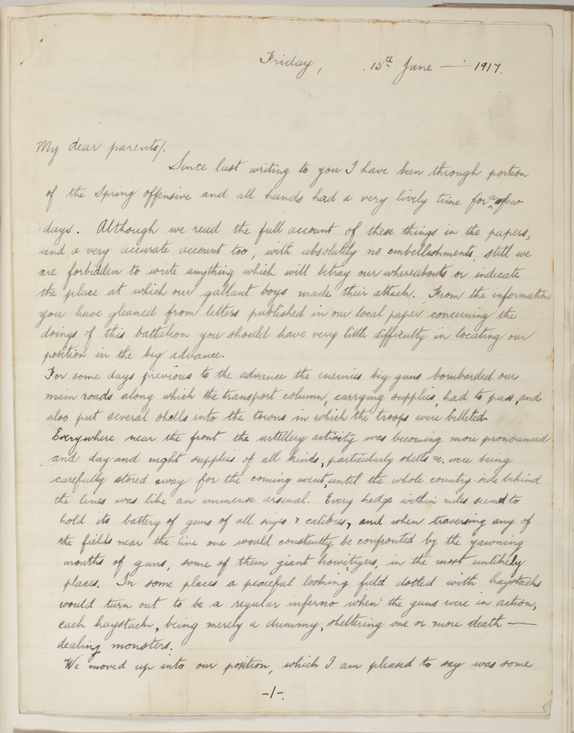 Since last writing to you I have been through portion of the Spring offensive and all hands had a very lively time for a few days. Although we read the full account of these things in the papers, and a very accurate account too, with absolutely no embellishments, still we are forbidden to write anything which will betray our whereabouts or indicate the place at which our gallant boys made their attack. From the information you have gleaned from letters published in our local paper concerning the doing of this battalion you should have very little difficulty in location our position in the big advance.