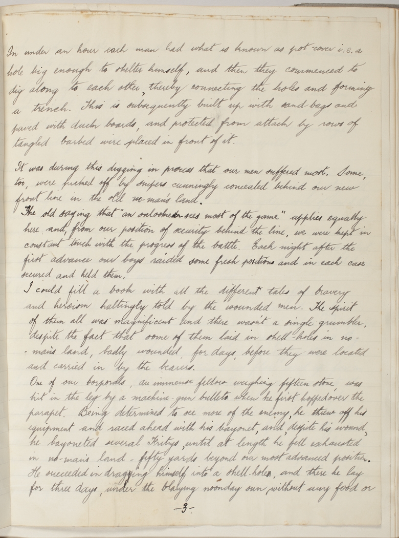 One of our Corporals, an immense fellow weighing fifteen stone, was hit in the leg by a machine gun bullet when he first hopped over the parapet. Being determined to see more of the enemy, he threw off his equipment and raced ahead with his bayonet, and, despite his wound, he bayoneted several Fritzs, until at length he fell exhausted in no-man's land - fifty yards beyond our most advanced position. He succeeded in dragging himself into a shell-hole, and there he lay for three days, under the blazing noonday sun, without any food or