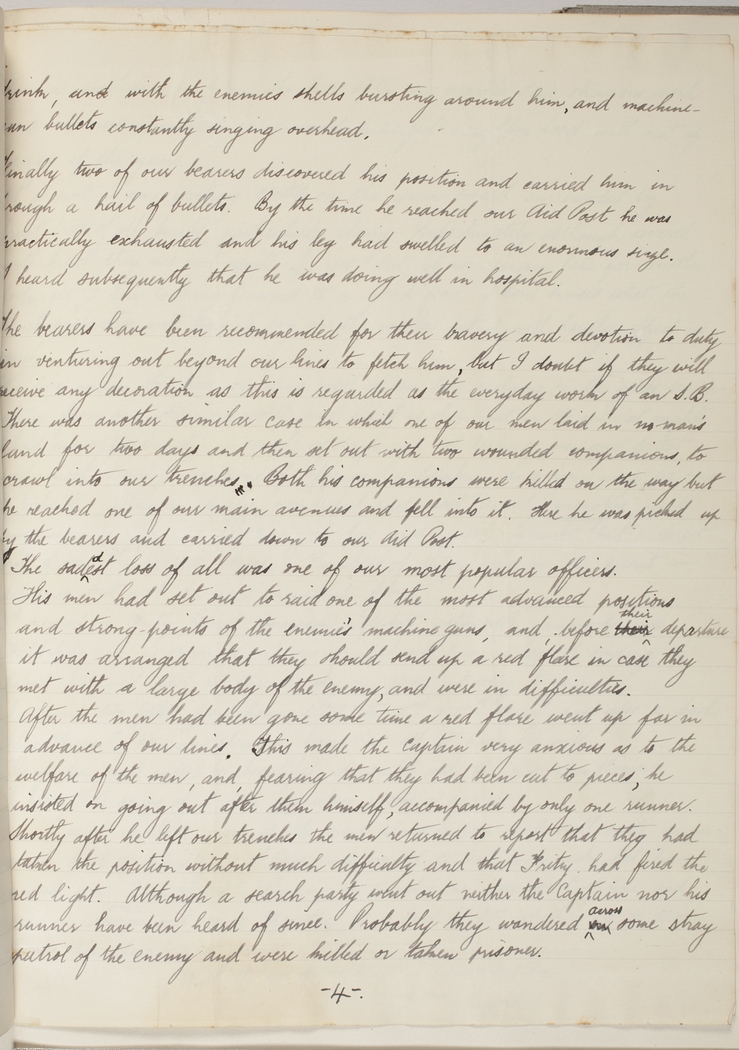 The bearers have been recommended for their bravery and devotion to duty in venturing out beyond our lines to fetch him, but I doubt if they will receive any decoration as this is regarded as the everyday work of an S.B. There was another similar case in which one of our men lay in no-man's land for two days and then set out with two wounded companions to crawl into our trenches. Both his companions were killed on the way but he reached one of our main avenues and fell into it. Here he was picked up by the bearers and carried down to our Aid Post.
