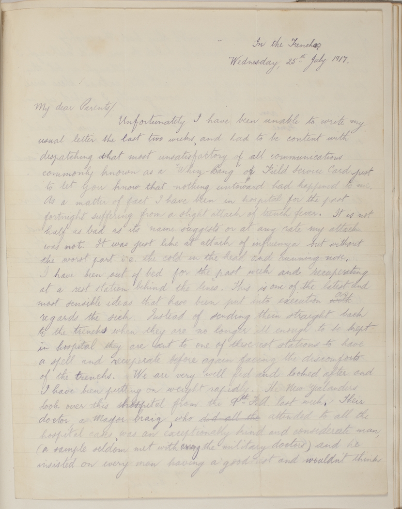 As a matter of fact I have been in hospital for the past fortnight suffering from a slight attack of trench fever. It is not half as bad as the name suggests or at any rate my attack was not. It was just like an attack of influenza but without the worst part i.e. the cold in the head and runny nose.