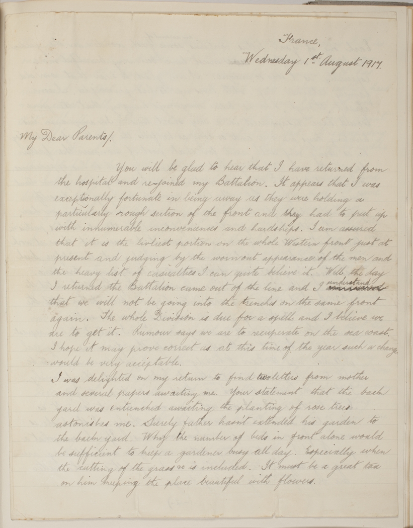 Well the day I returned the Battalion came out of the line and I understand that we will not be going into the trenches on the same front again. The whole Division is due for a spell and I believe we are to get it. Rumour says we are to recuperate on the sea coast. I hope it may prove correct as at this time of year such a change would be very acceptable.