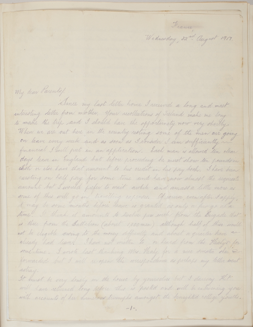 Since my last letter home I received a long and most interesting letter from mother. Your recollections of Ireland make me long to make the trip and I should have the opportunity now very shortly.