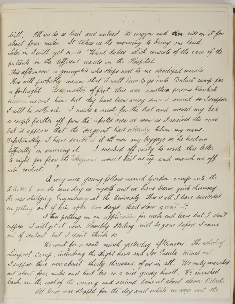 This afternoon a youngster who sleeps next to me developed measles. This will probably mean that I will have to go into Contact camp for a fortnight. As a matter of fact there was another persons blankets between me and him but they have been away since I arrived so I suppose I will be collared. I made a rush for the hut and moved my bed a couple further off from the infected area as soon as I received the news but it appears that the Sergeant had already taken my name. Unfortunately I have scribbled it all over my baggage so he had no difficulty in securing it. I sneaked off early to write this letter to-night for fear the Sergeant would bail me up and march me off into contact.