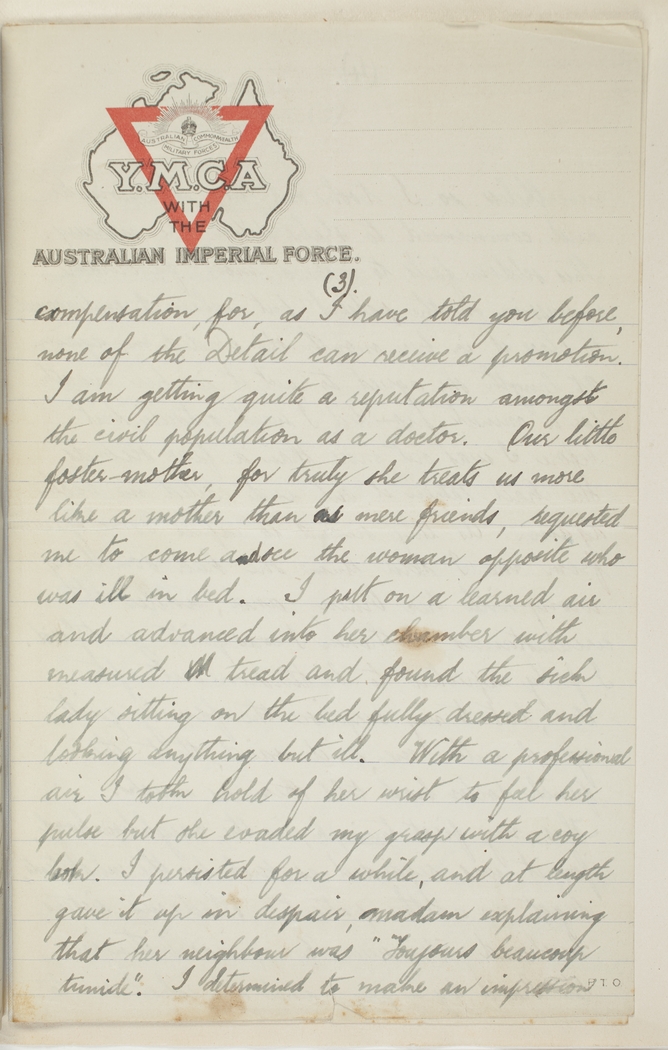 Our little foster mother, for truly she treats us more as a mother than as mere friends, requested me to come and see the woman opposite who was ill in bed. I put on a learned air and advanced into her chamber with measured tread and found the sick lady sitting on the bed fully dressed and looking anything but ill.