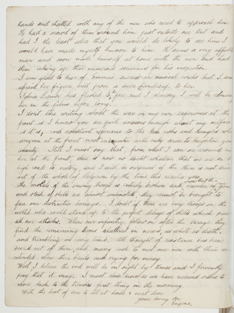 I don't like writing about the war or my own experiences at the front as I know you are quite anxious enough about my welfare as it is, and constant reference to the risks and dangers which anyone at the front must encounter will only serve to heighten your anxiety. Still I must say that, from what I can see around me here at the front, there is now no doubt whatever that we are on the high road to victory, and I will be surprised if the Hun is not driven out of the whole of Belgium by the time this reaches you.