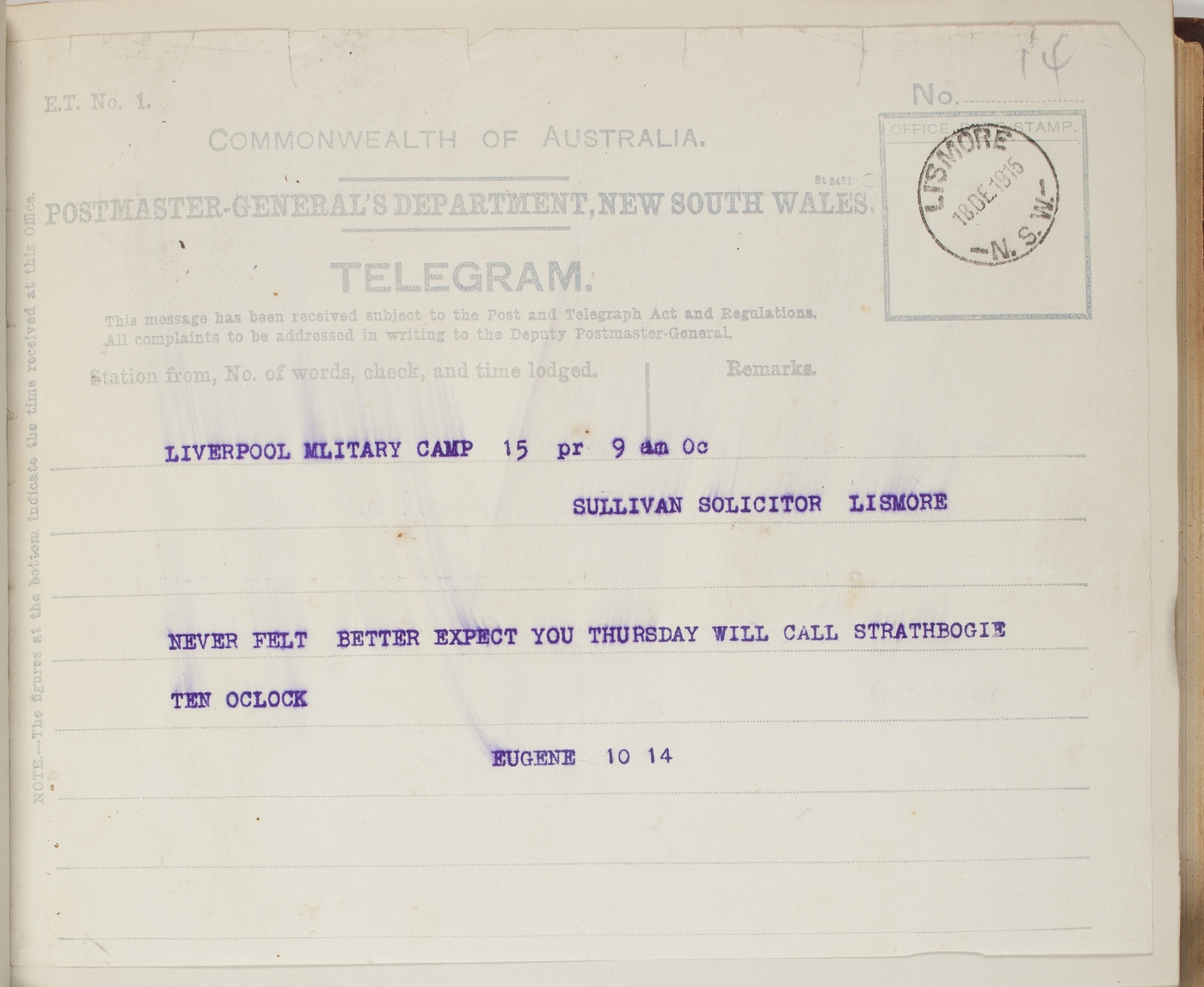 Telegram: Lismore 18 Dec. 1915