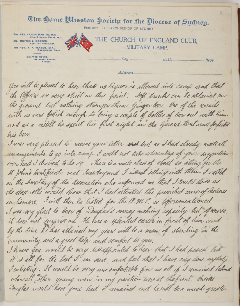 I have everything I could possibly require in the way of clothes & money. In fact I am very sorry now that I did not leave more of both of them at home. The money is safe as I invested in a money belt and wear it constantly. I have left my port containing most of my clothes at Sharpe's and will take more of them in this week-end. We are allowed from 12 noon on Saturday till 12 noon on Sunday off but I intend applying for an extention till Monday morning.