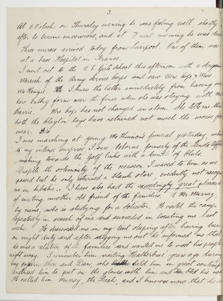 I went out to the N.E. Girls' School this afternoon with a Sergeant Merrick of the Army Service Corps and saw Mrs. Cope, & Miss McKenzie. I knew the latter immediately from having seen her bulky form over the fence when she was staying with Mrs. Barrie. Mrs. Cope had not changed an atom. She tells me that both the Clayton boys have returned not much the worse for wear.