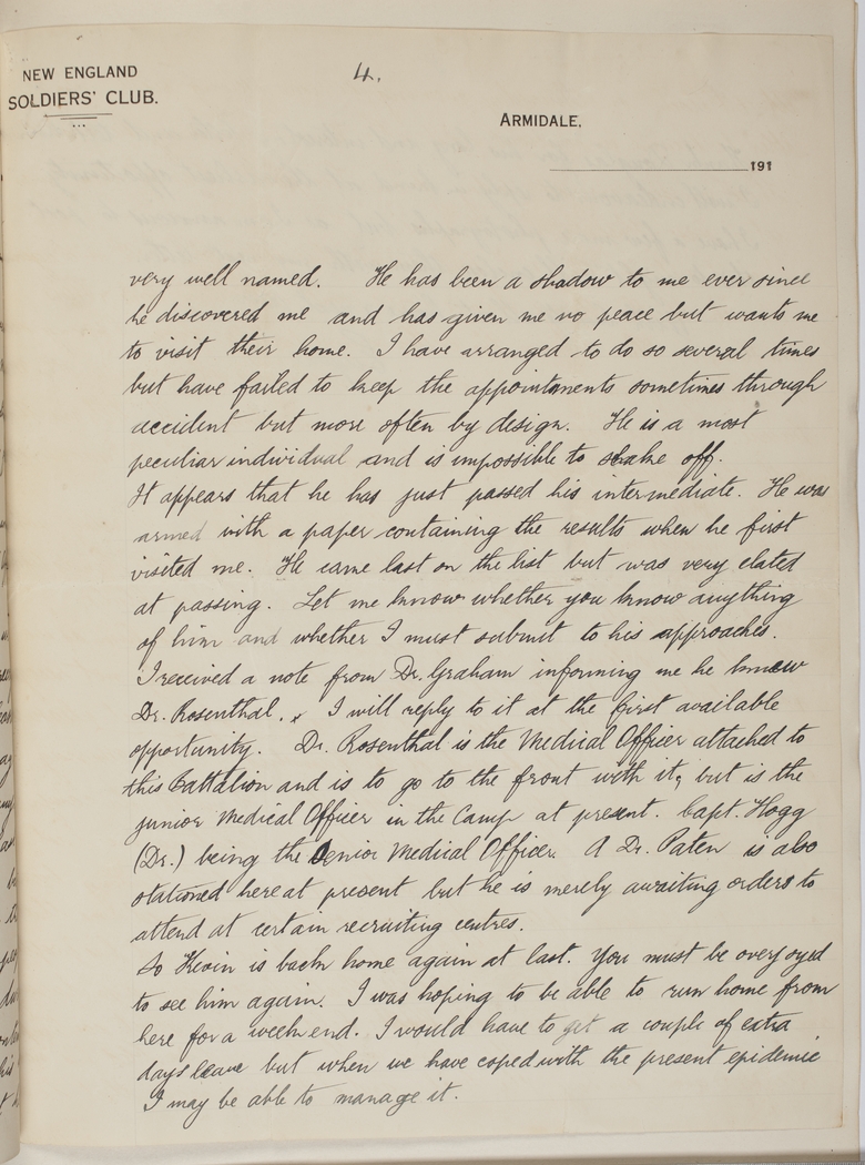 I received a note from Dr. Graham informing me he knew Dr. Rosenthal. I will reply to it at the first available opportunity. Dr. Rosenthal is the Medical Officer attached to this Battalion and is to go to the front with it, but is the Junior Medical Officer in the Camp at present. Capt. Hogg (Dr.) being the Senior Medical Officer. A Dr. Paten is also stationed here at present but he is merely awaiting orders to attend at certain recruiting centres.