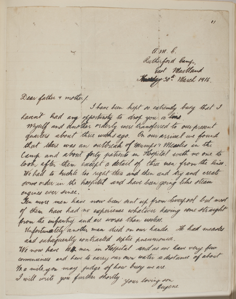 Myself and another orderly were transferred to our present quarters about three weeks ago. On our arrival we found that there was an outbreak of Mumps & Measles in the Camp and about forty patients in the Hospital with no one to look after them except a detail of men from the lines. We had to buckle to right there and then and try and create some order in the hospital and have been going like steam engines ever since.