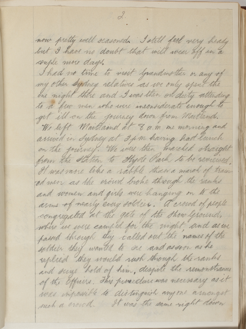 We left Maitland at 8 a.m. one morning and arrived in Sydney at 2 p.m. having had lunch on the journey. We were then marched straight from the Station to Hyde Park to be reviewed. It was more like a rabble than a march of trained men as the crowd broke through the ranks and women and girls were hanging on to the arms of nearly every soldier.