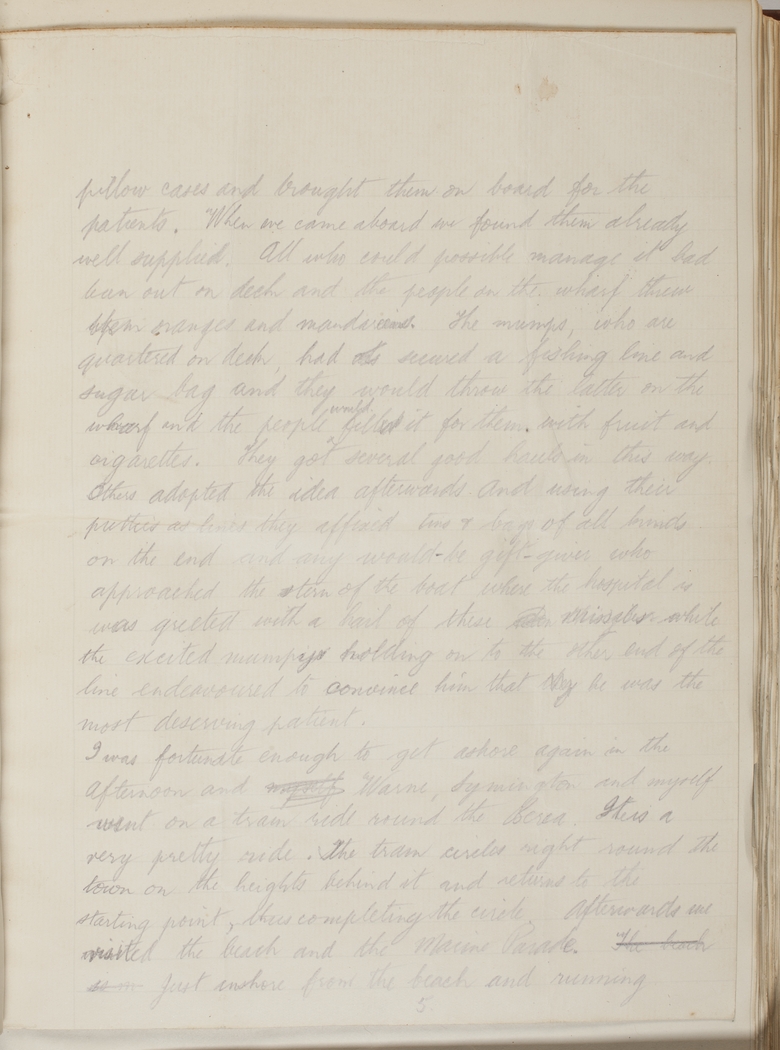 pillow cases and brought them on board for the patients. When we came aboard we found them already well supplied. All who could possibly manage it had been out on deck and the people on the wharf threw them oranges and mandarins. The mumps, who are quartered on deck, had secured a fishing line and sugar bag and they would throw the latter on the wharf and the people would fill it for them with fruit and cigarettes. They got several good hauls in this way. Others adopted the idea afterwards and using their puttees and lines they affixed line & bags of all kinds on the end and any would-be gift-giver who approached the stern of the boat where the hospital is was greeted with a hail of these missiles while the excited mumpy holding on to the other end of the line endeavoured to convince him that he was the most deserving patient.