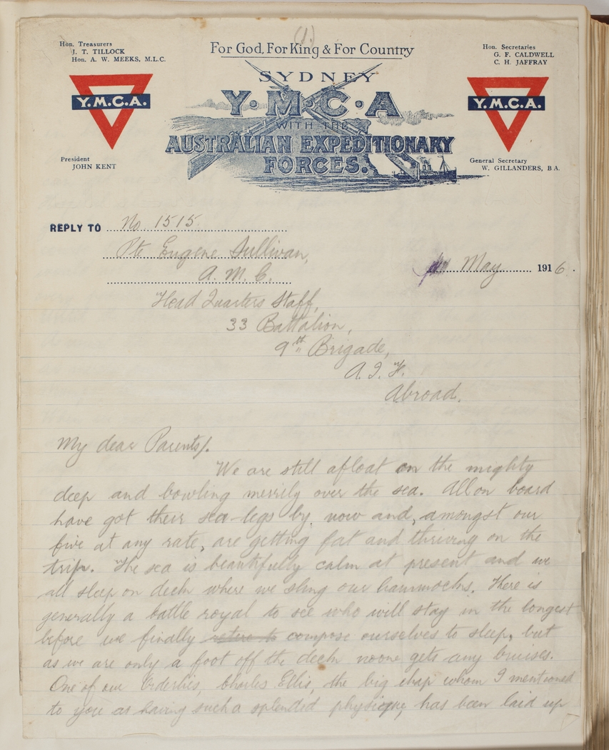 The sea is beautifully calm at present and we all sleep on deck where we sling our hammocks. There is generally a battle royal to see who will stay on the longest before we finally retire to ourselves to sleep, but as we are only a foot off the deck none gets any bruises. One of the Orderlies, Charles Ellis, the big chap whom I mentioned to you as having such a splendid physique, has been laid up