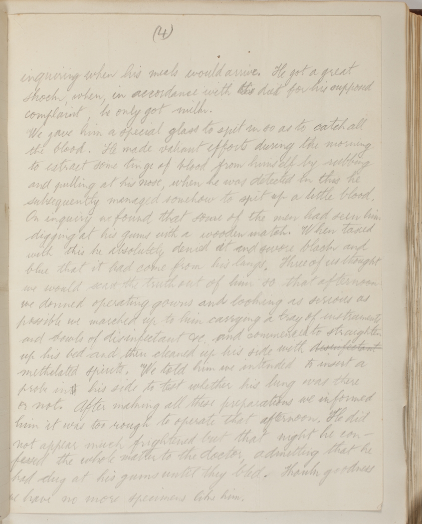 We gave him a special glass to spit in so as to catch all the blood. He made valiant efforts during the morning to extract some tinge of blood from himself by rubbing and pulling at his nose, when he was detected in this he subsequently managed somehow to spit up a little blood. On inquiry we found that some of the men had seen him digging at his gums with a wooden match. When taxed with this he absolutely denied it and swore black and blue that it had come from his lungs.