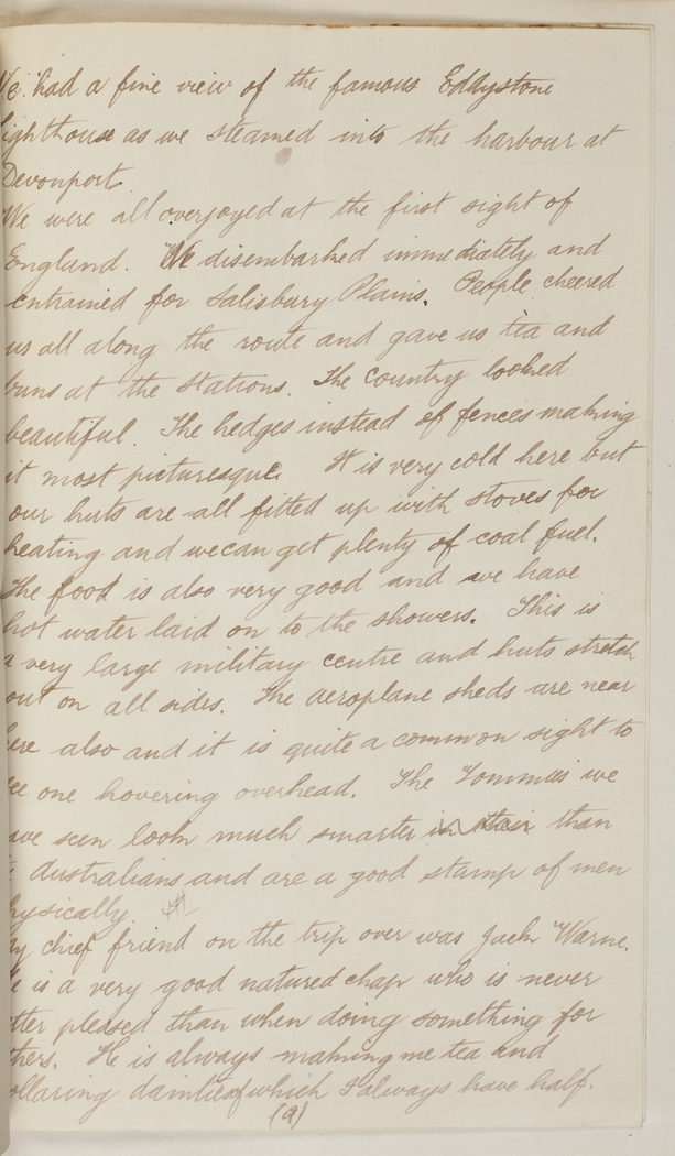 We were all overjoyed at the first sight of England. We disembarked immediately and entrained for Salisbury Plains. People cheered us all along the route and gave us tea and buns at the Stations. The country looked beautiful. The hedges instead of fences making it most picturesque. It is very cold here but our huts are all fitted up with stoves for heating and we can get plenty of coal fuel. The food is very good and we have hot water laid on to the showers. This is a very big military centre and huts stretch out on all sides. The aeroplane sheds are near here also and it is quite a common sight to see one hovering overhead. The Tommies we have seen look much smarter than the Australians and are a good stamp of men physically.