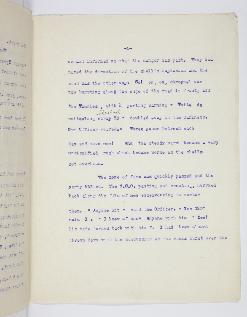 The zone of fire was quickly passed and the party halted. The N.C.O. panting and sweating, hurried back along the file of men endeavouring to muster them. "Anyone hit" said the Officer. "Yes Sir" said I. "I know of one" Anyone with him "Yes! his mate turned back with him". I had been almost thrown down with the concussion as the shell burst over the