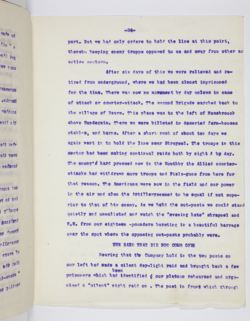 After six days of this we were relived and retired from underground, where we had been almost imprisoned for the time. There was now no movement by day unless in case of attack or counter-attack. The second Brigade marched back to the village of Baure. This place was to the left of Hazebrouck above Hondegeim. There we were billeted in deserted farm-houses stables, and barns. After a short rest of about ten days we again went in to hold the line near Strayeel. The troops in this sector had been making continual raids both by night & by day. The enemy's hard pressed now in the South by the Allied counter-attacks had withdrawn more troops and Field-guns from here for that reason. The Americans were now in the field and our power in the air and also the Artillery seemed to be equal if not superior to that of hte enemy. As we held the out-posts we could stand quietly and unmolested and watch the "evening hate" shrapnel and H.E. from our eighteen-pounders bursting in a beautiful barrage over the spot where the opposing out-posts probably were.