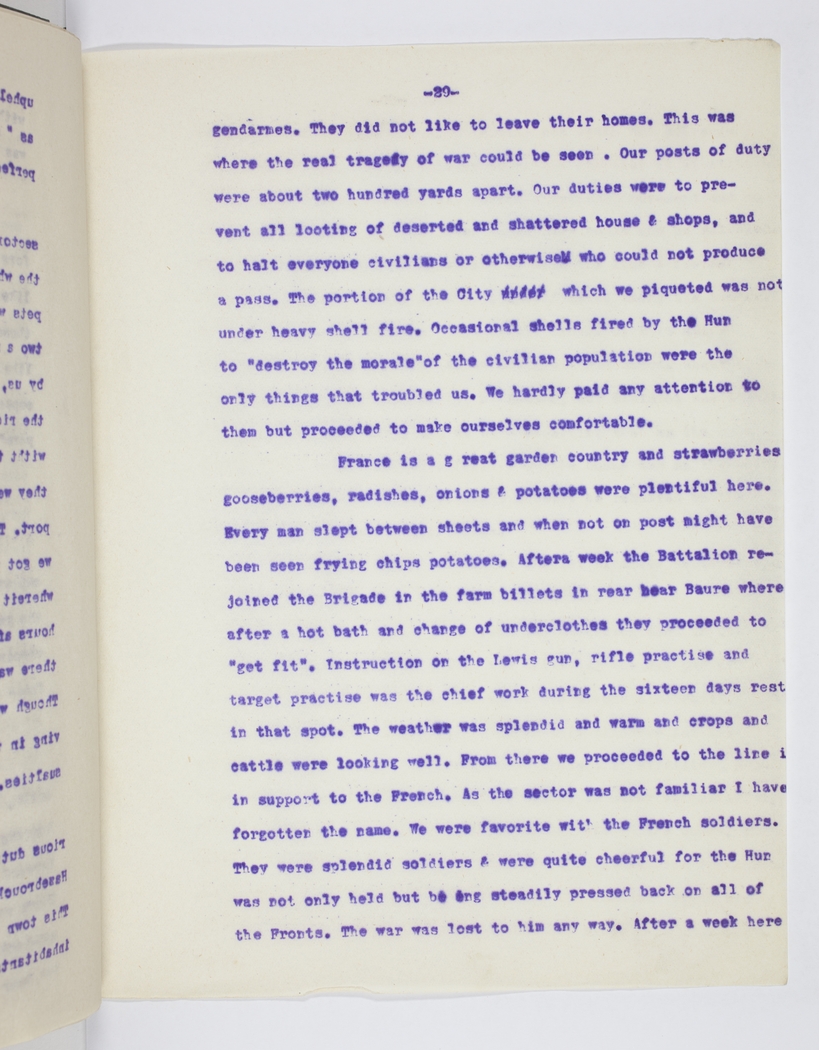 gendarmes. They did not like to leave their homes. This was where the real tragedy of the war could be seen. Our posts of duty were about two hundred yards apart. Our duties were to prevent all looting of deserted and shattered house & shops, and to halt everyone civilians or otherwise who could not produce a pass. The portion of the City which we piqueted was not under heavy shell fire. Occasional shells fired by the Hun to "destroy the morale" of the civilian population were the only things that troubled us. We hardly paid any attention to them but proceeded to make ourselves comfortable. France is a g reat garden country and strawberries, radishes, onions & potatoes were plentiful here. Every man slept between sheets and when not on post might have been seen frying chips potatoes. After a week the Battalion rejoined the Brigade in the farm billets in rear near Baure where after a hot bath and change of underclothes they proceeded to "get fit". Instruction on the Lewis gun, rifle practise and target practise was the chief work during the sixteen days rest in that spot. The weather was splendid and warm and crops and cattle were looking well. From there we proceeded to the line in support of the French. As the sector was not familiar I have forgotten the name. We were favourite wit' the French soldiers. They were splendid soldiers & were quite cheerful for the Hun was not only held but being steadily pressed back on all of the Fronts. The war was lost to him any way. After a week here