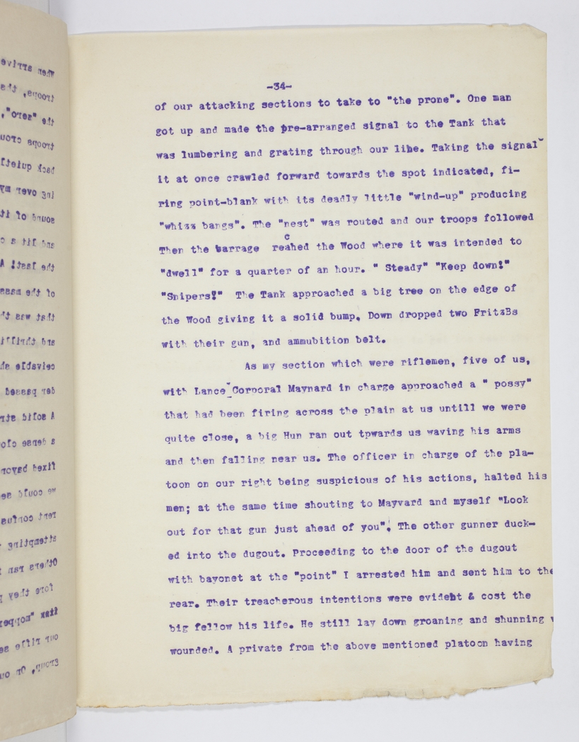 of our attacking sections to take to "the prone". One man got up and made the pre-arranged signal to the Tank that was lumbering and grating through our line. Taking the signal it at once crawled forward to the spot indicated, firing point-blank with its deadly little "wind-up" producing "whiz bangs". The "nest" was routed and our troops followed Then the barrage reached the Wood where it was intended to "dwell" for a quarter of an hour. "Steady" "Keep down!" "Snipers!" The Tank approached a big tree on the edge of the Wood giving it a solid bump. Down dropped two Fritz's with their gun, and ammubition belt. As my section which were riflemen, five of us, with Lance Corporal Maynard in charge approached a "possy" that had been firing across the plain at us untill we were quite close, a big Hun ran out towards us waving his arms and then falling near us. The officer in charge of the platoon on our right being suspicious of his actions, halted his men; at the same time shouting to Mayvard and myself "Look out for that gun just ahead of you". The other gunner ducked into the dugout. Proceeding to the door of the dugout with bayonet at the "point" I arrested him and sent him to the rear. Their treacherous intentions were evident & cost the big fellow his life. He still lay down groaning and shunning wounded. A private from the above mentioned platoon having