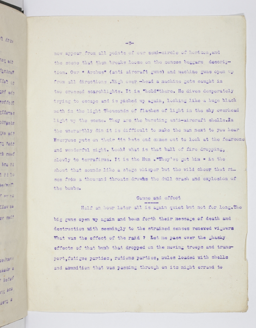 now appear from all points of our semi-circle of horizon, and the scene that then breaks loose on the senses beggars description. Our "Archus" (anti aircraft guns) and machine guns open up from all directions. High over-head a machine gets caught in two crossed searchlights. It is "held" there. He dives desperately trying to escape and is picked up again, looking like a huge black moth in the light Thousands of flashes of light in the sky overhead light up the scene. They are the bursting anti-aircraft shells. In the unerarthly din it is difficult to make the man next to you hear Everyone puts on their tin hats and comes out to look at the fearsome and wonderful sight. Look! what is that ball of fire dropping slowly to terrafirma. It is the Hun. "They've got him" is the shout that sounds like a stage whisper but the wild cheer that rises from a thousand throats drowns the dull crash and explosion of the bombs.