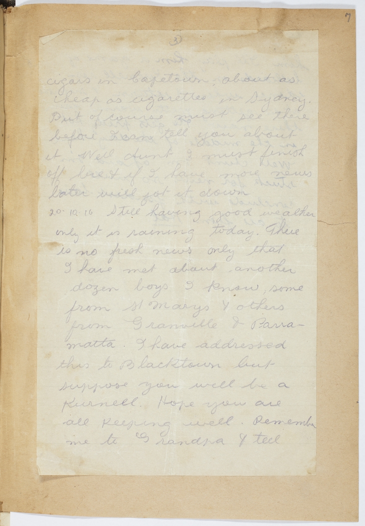 20.10.16 Still having good weather only it is raining today. There is no fresh news only that I have met about another dozen boys I know, some from St Marys & others from Granville & Parramatta. I have addressed this to Blacktown but suppose you will be a Kurnell. Hope you are all keeping well. Remember me to Grandpa & tell