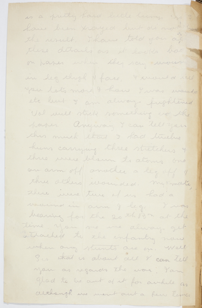 is a pretty hard little lump so I have been xrayed but do not have the result. I have told you all these details as it looks bad on paper when they say wounded in leg thigh & face. I would tell you lots more & how I was wounded etc but I am always frightened Vol will stick something in the paper. Anyway I can tell you this much that I had twelve huns carrying three stretchers & three were blown to atoms one an arm off another a leg off & three others wounded. My mate, there were two of us had a wound in arm & leg. I was bearing for the 20th Bn at the time. You see we always get attached to the infantry now when any stunts are on. Well Sis that is about all I can tell you as regards the war. I am glad to be out of it for a while as although we went out a few times