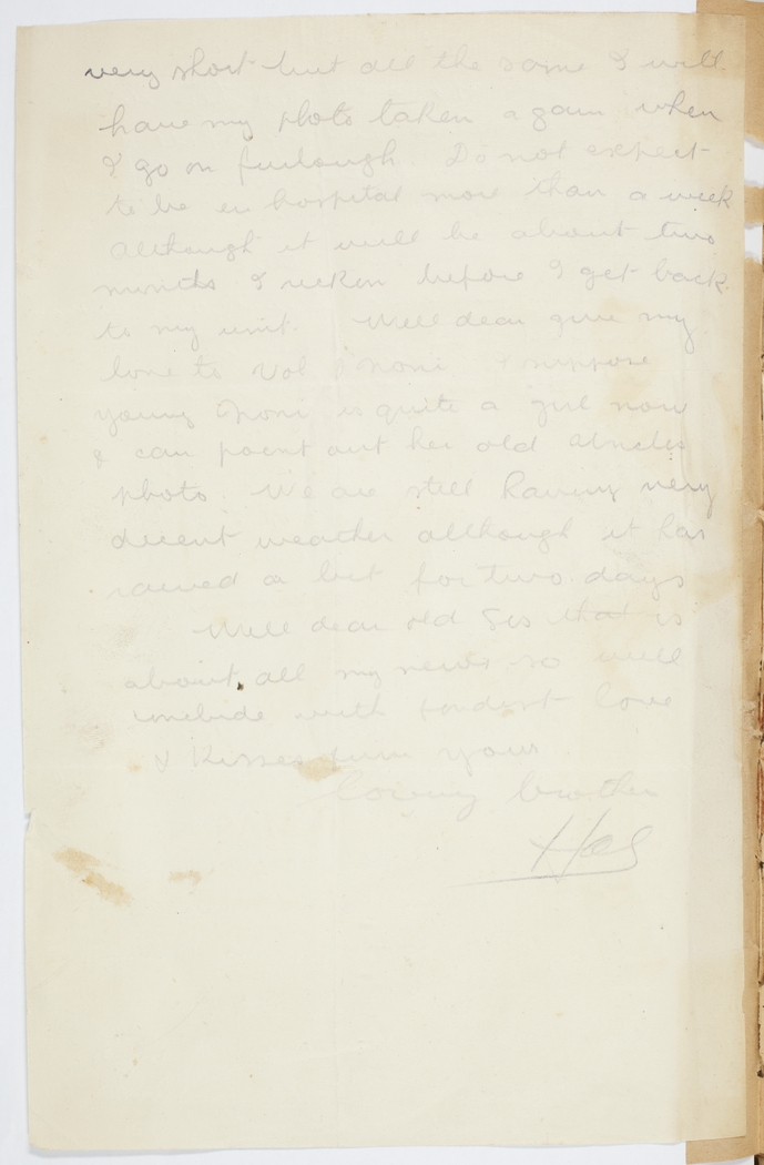 very short but all the same I will have my photo taken again when I go on furlough. Do not expect to be in hospital more than a week although it will be about two months I reckon before I get back to my unit. Well dear give my love to Vol & Noni. I suppose young Noni is quite a girl now & can point out her old uncles photo. We are still having very decent weather although it has rained a bit for two days. Well dear old Sis that is about all my news so will conclude with fondest love & kisses from your loving brother Hal
