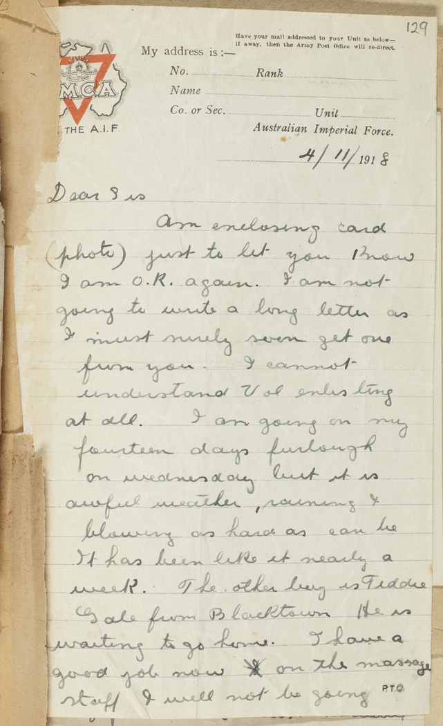Am enclosing card (photo) just to let you know I am O.K. again. I am not going to write a long letter as I must surely get one from you. I cannot understand Vol enlisting at all. I am going on my fourteen days furlough on Wednesday but it is awful weather, raining & blowing as hard as can be. It has been like it nearly a week. The other boy is Teddie Gale from Blacktown. He is waiting to go home. I have a good job now on the massage staff & will not be going PTO